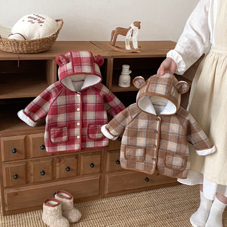 [73-120cm] チェック柄 フード付き モコモコ アウター