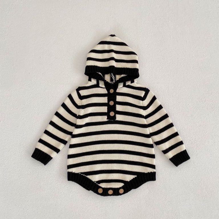 [66-100cm]フード付き ロンパース ボーダー柄 肌に優しい