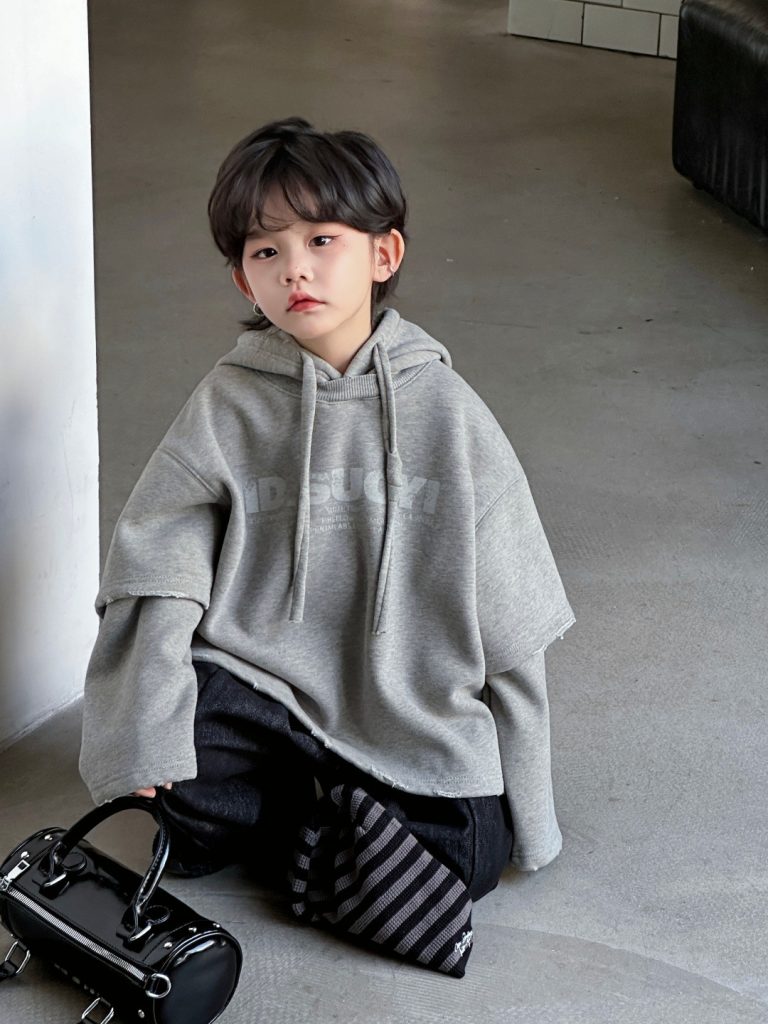 [100-160cm]レイヤードデザイン フード付き パーカー