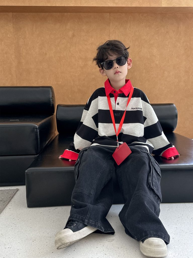 [100-160cm]配色 ボーダー柄 POLOネック トップス