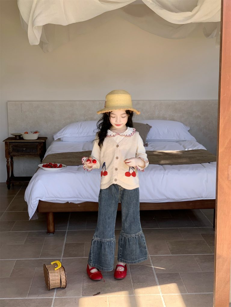 [90-140cm]チェリー柄 女の子 ベスト/トップス/デニムパンツ
