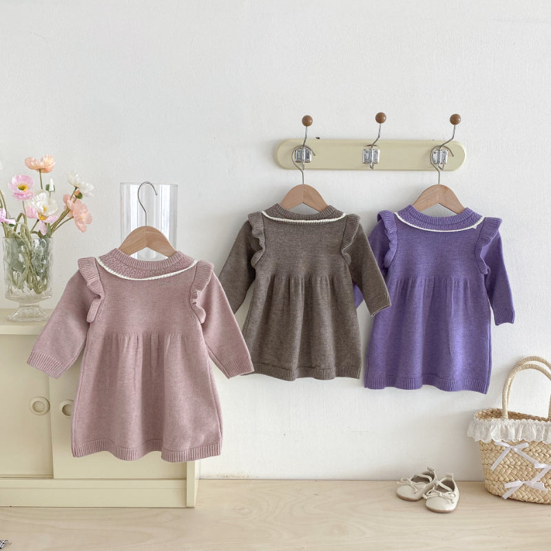[80-120cm]折り襟 バイカラー 重ね着風 長袖 ワンピース