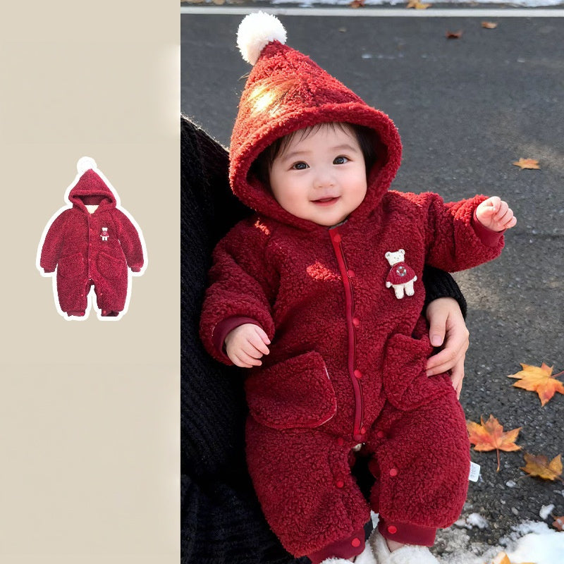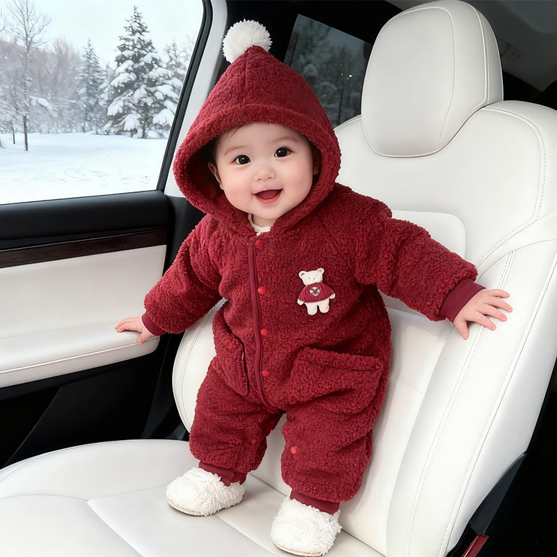 [66-100cm] くまワッペン あったか フード付き カバーオール