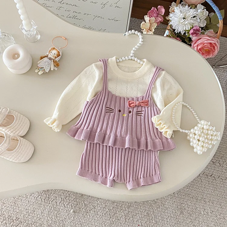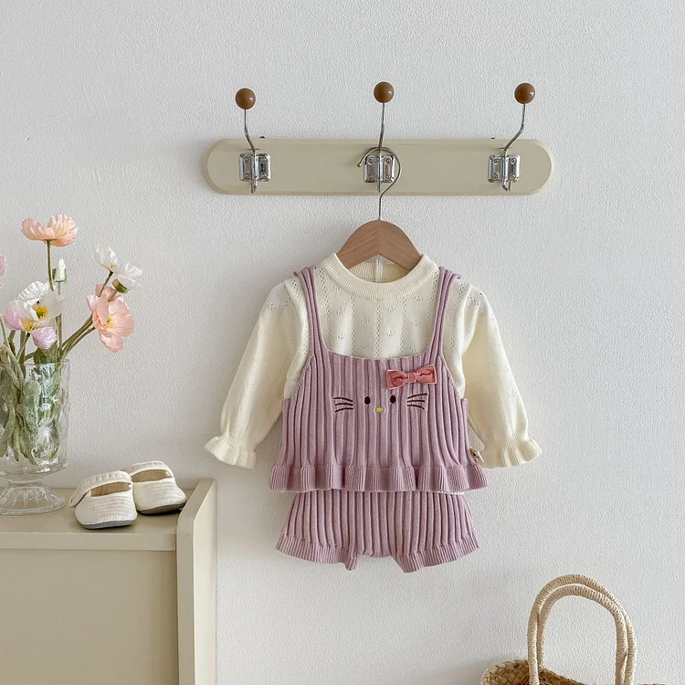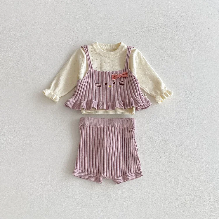 [66-100cm] フリル トップス &ネコ 刺繡 3点セット