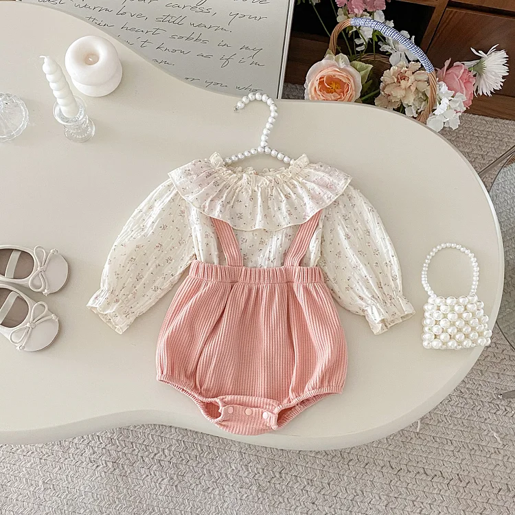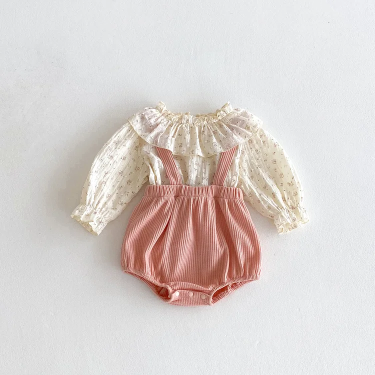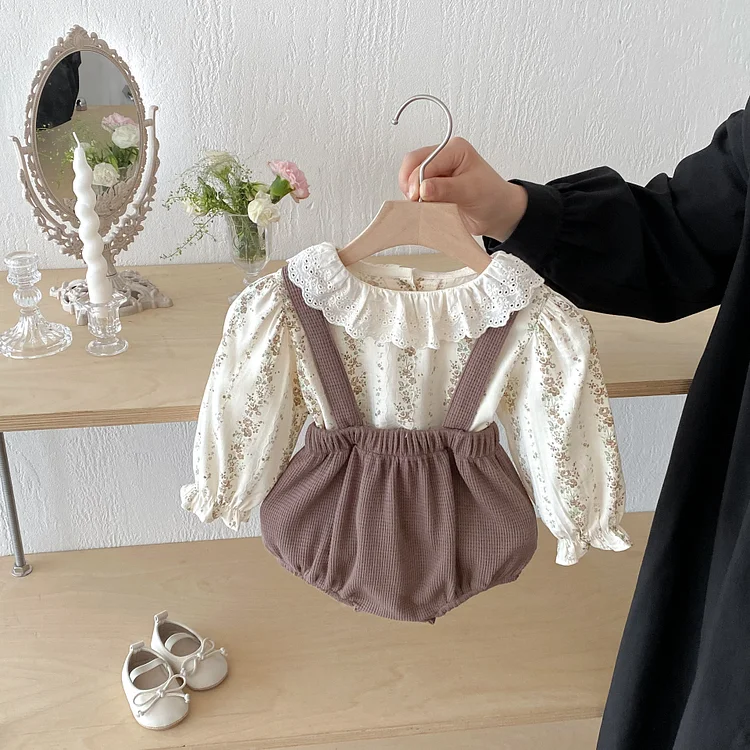 [66-100cm] 丸襟 小花柄 トップス & サロペット ロンパース