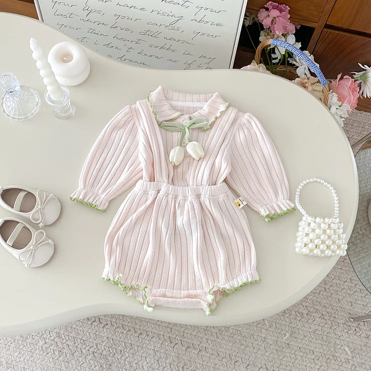 [66-90cm]ロンパース リボン レース襟 定番 肌触り良い ベビー服