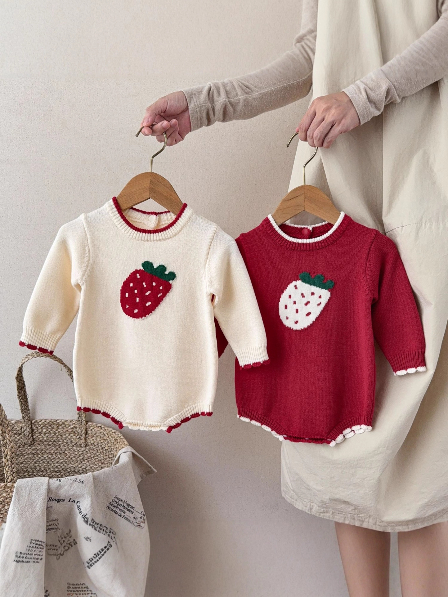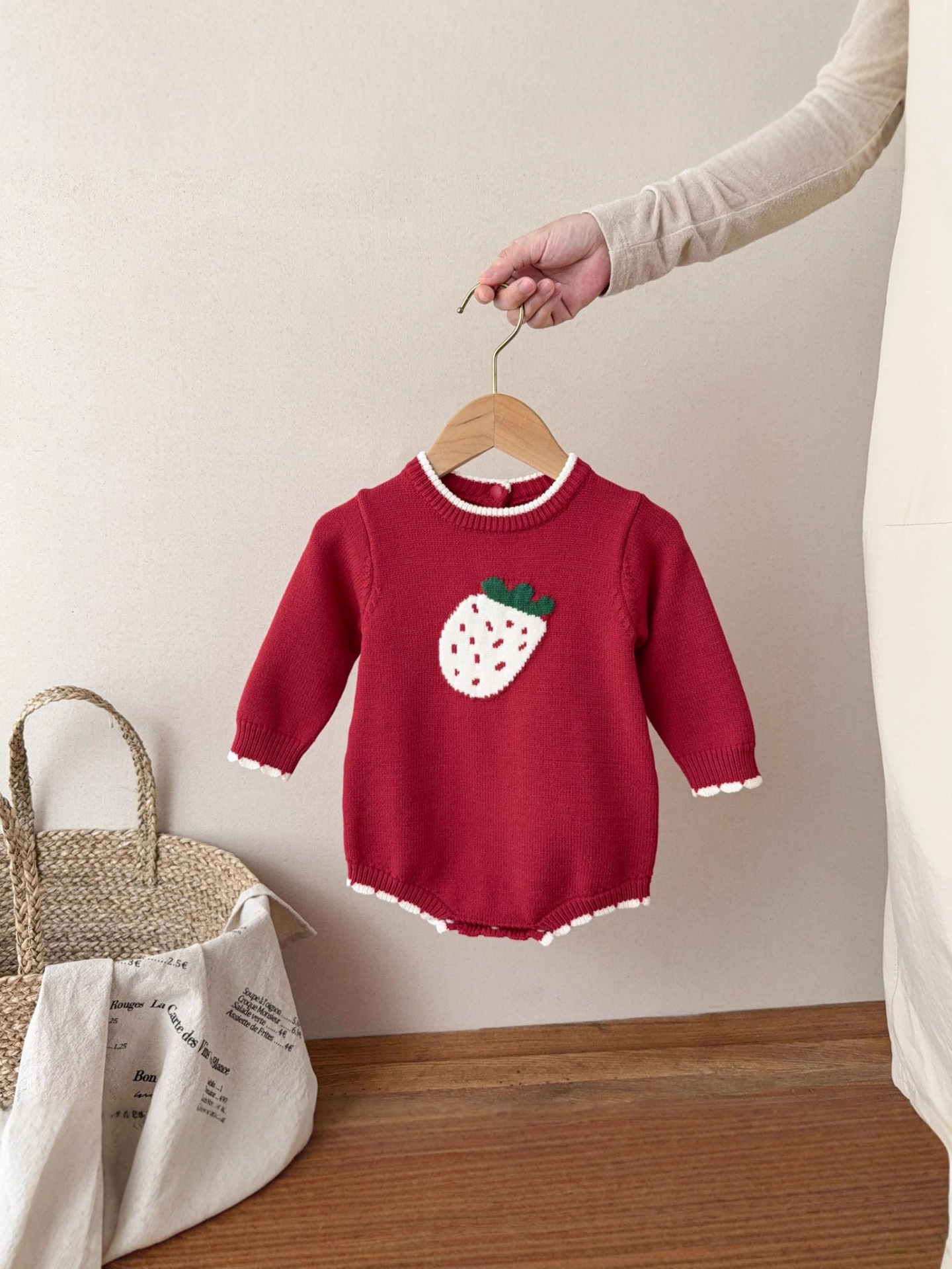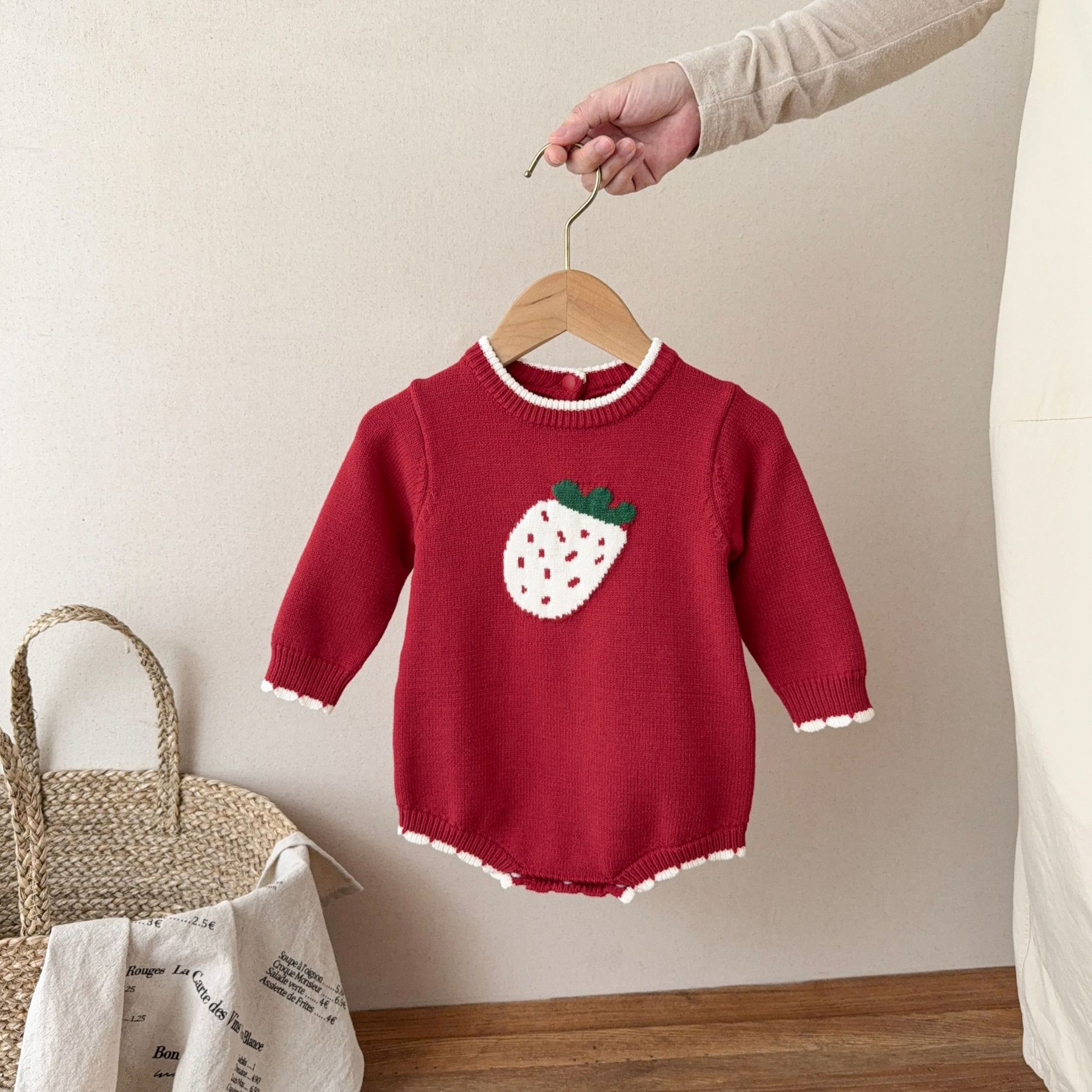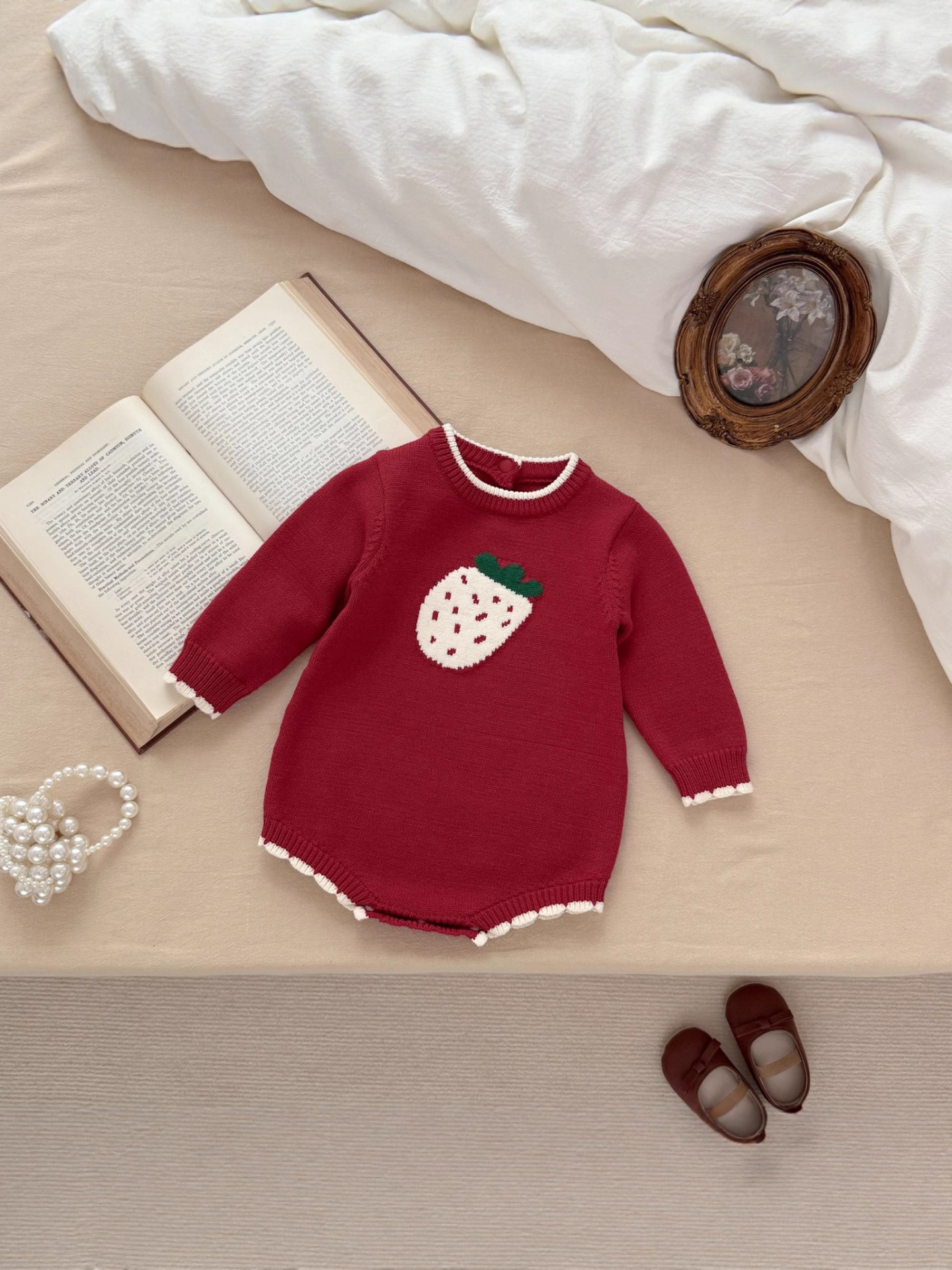 [66-90cm]いちご柄 ガーリー ベビー ニット ロンパース