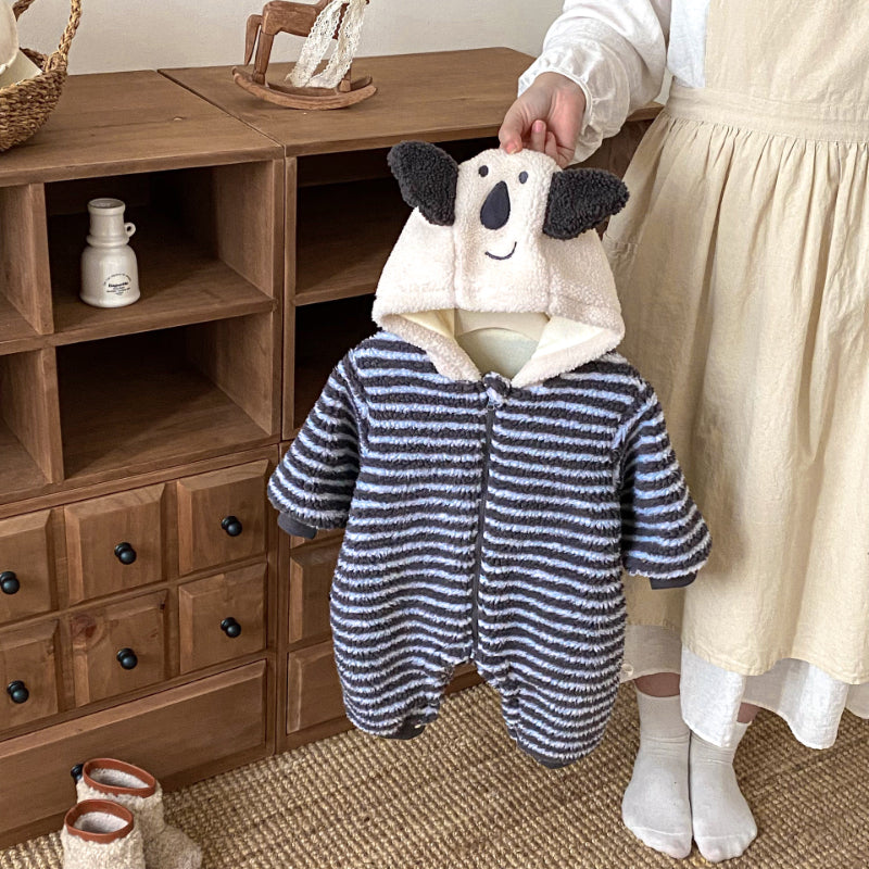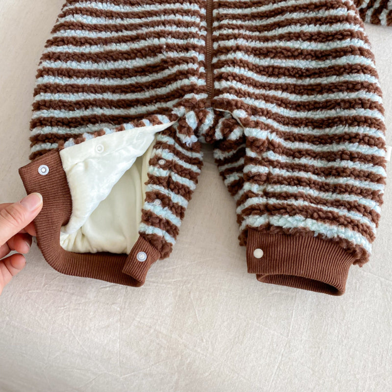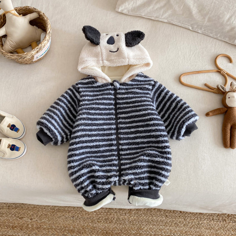 [66-90cm]ボーダー 裏起毛 フード カバーオール