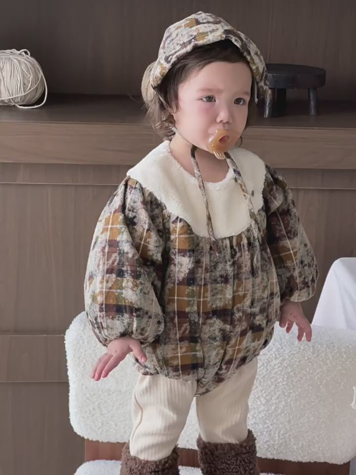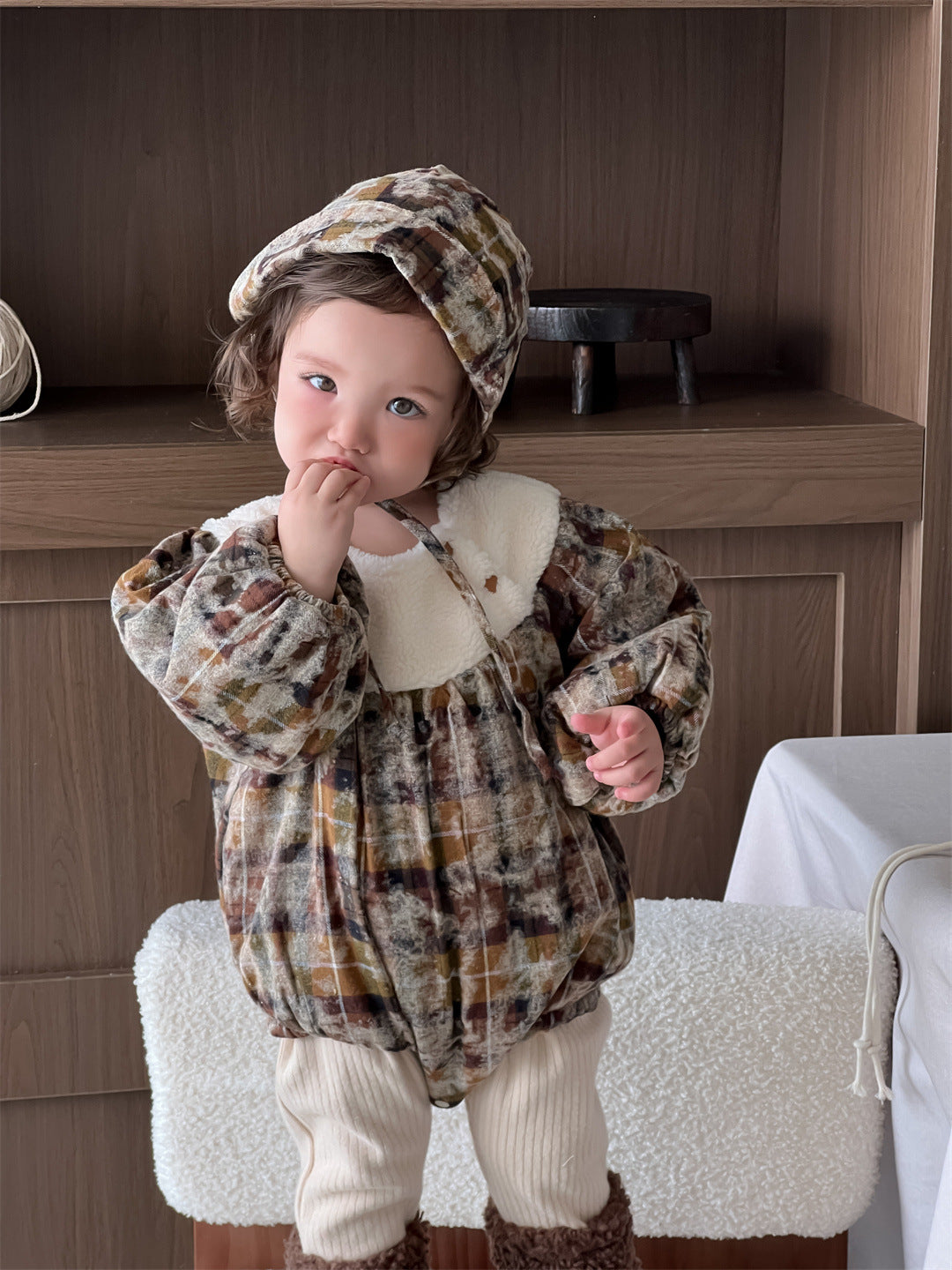 [66-90cm]レトロ チェック 暖かい ロンパース