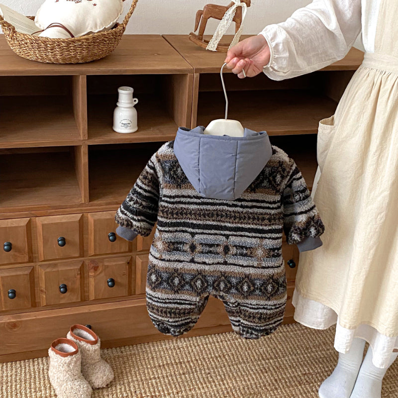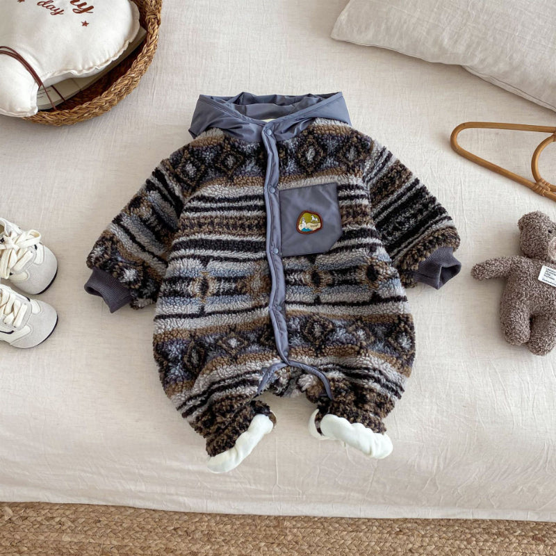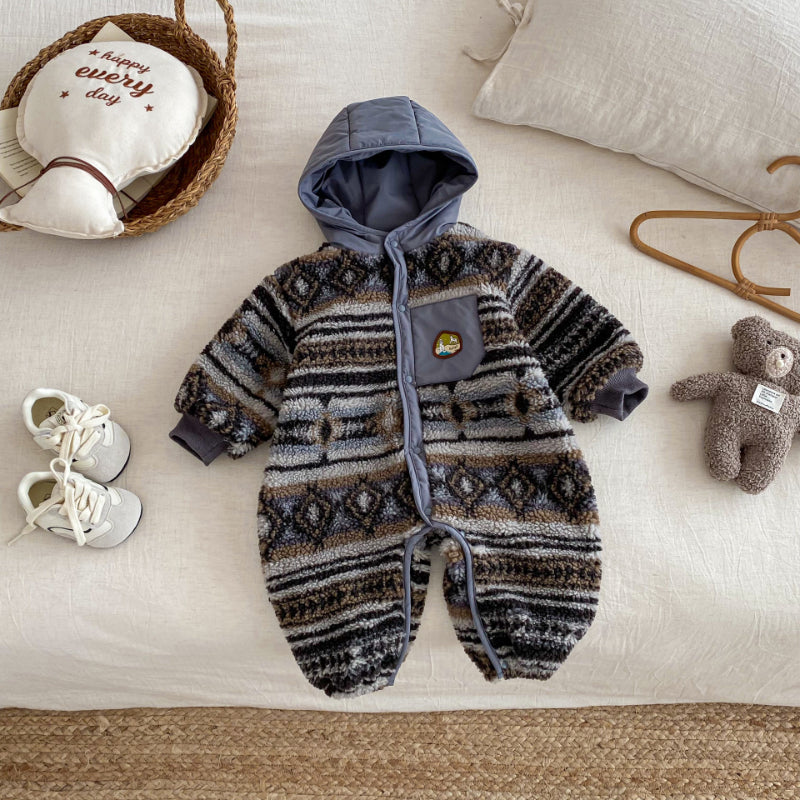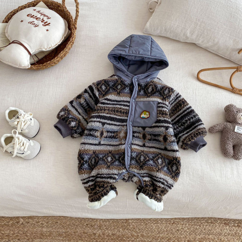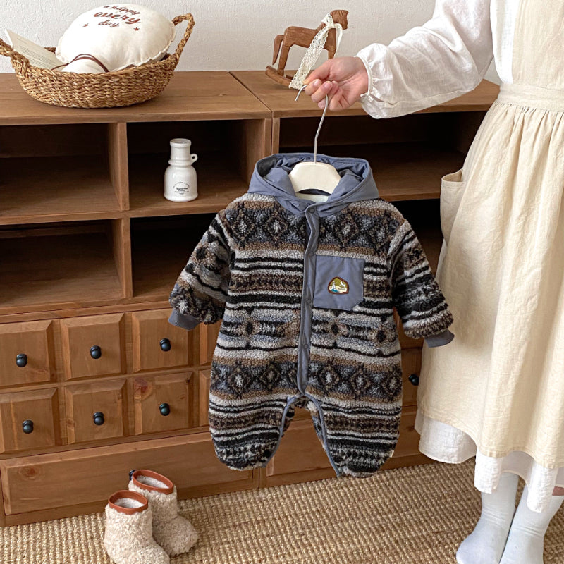 [66-90cm]レトロ フード 裏起毛 カバーオール