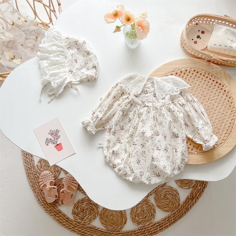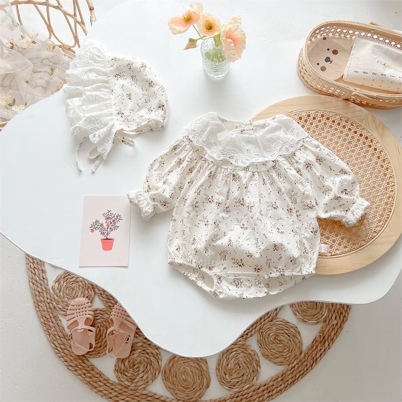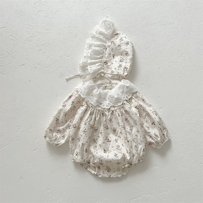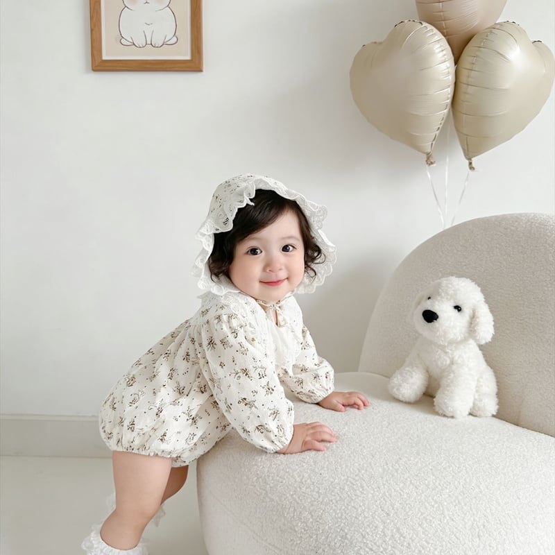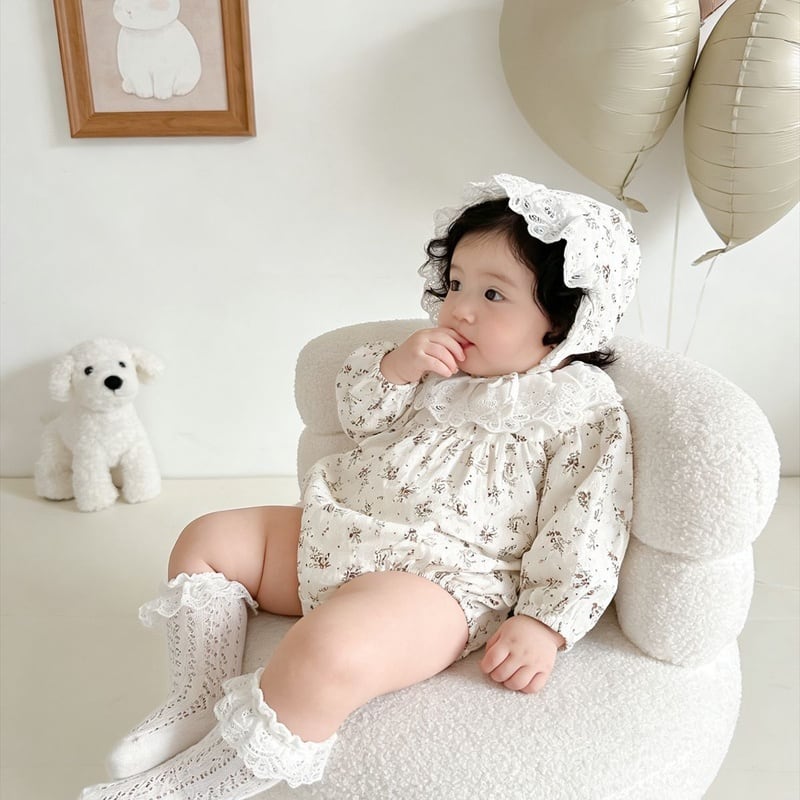 [66-90cm]ロンパース&帽子 レース おしゃれ 肌に優しい ベビー服
