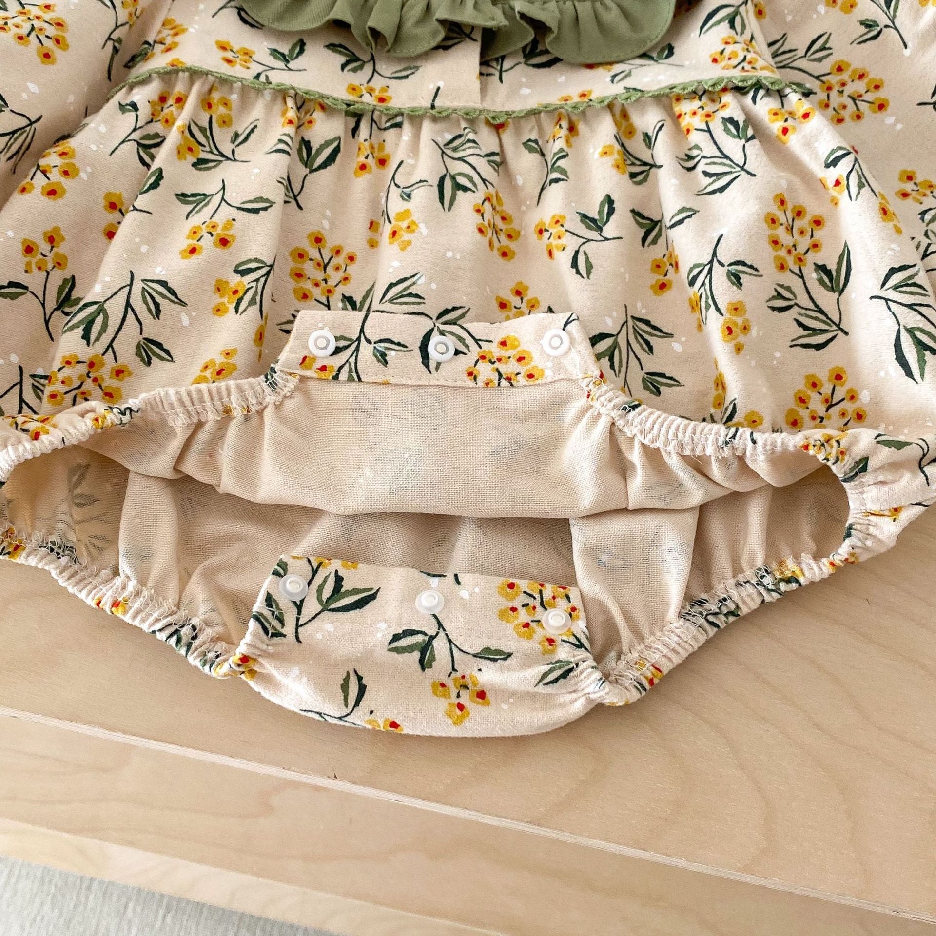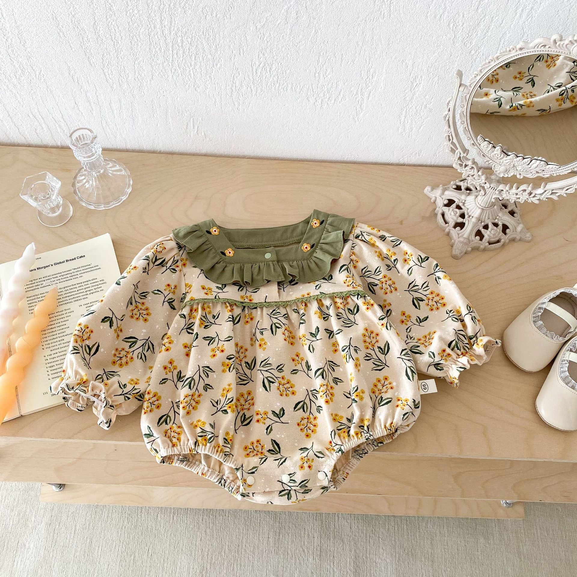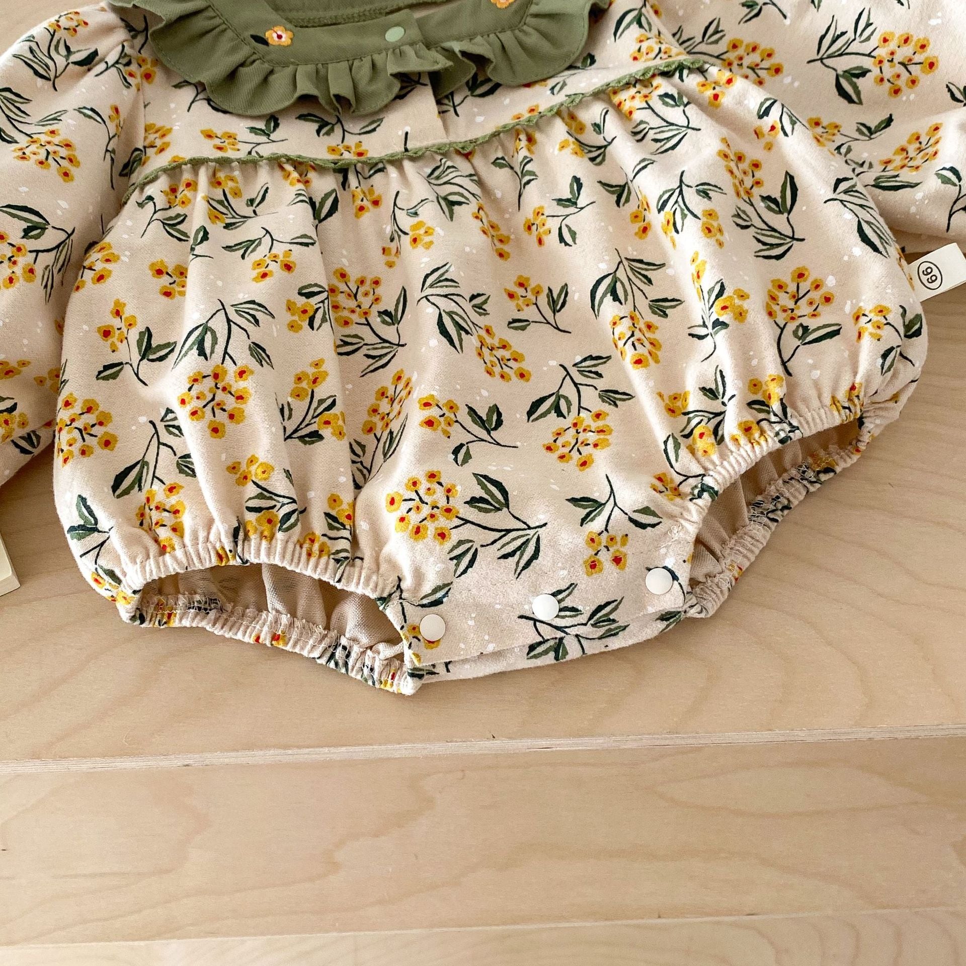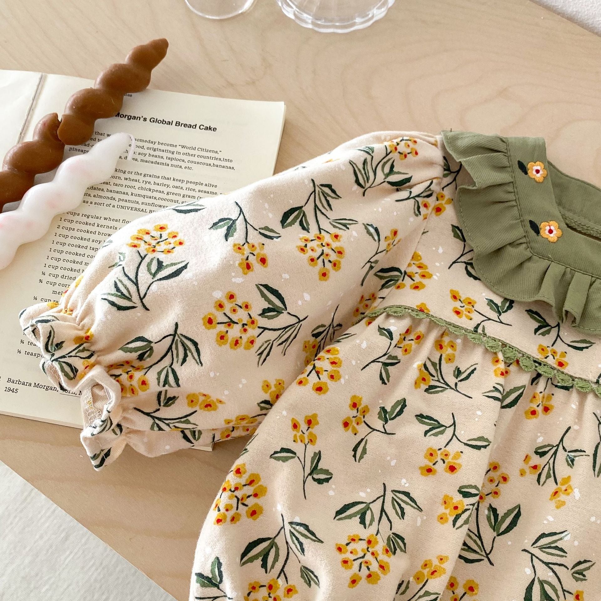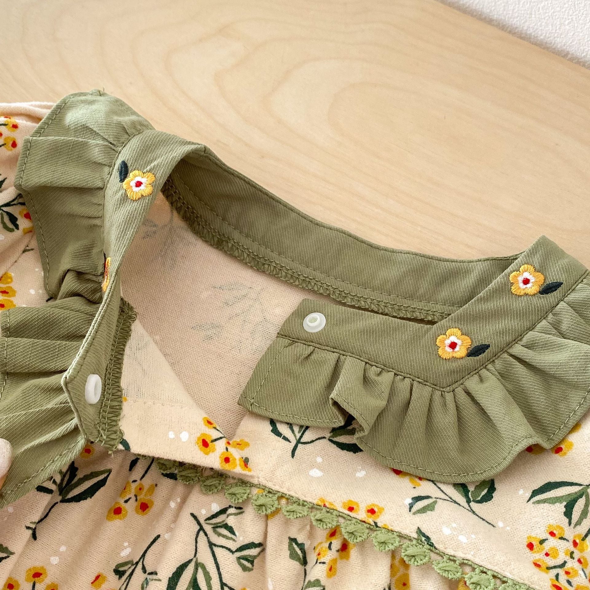 [66-90cm]ロンパース グリーン襟 可愛い 花柄 ロンパース