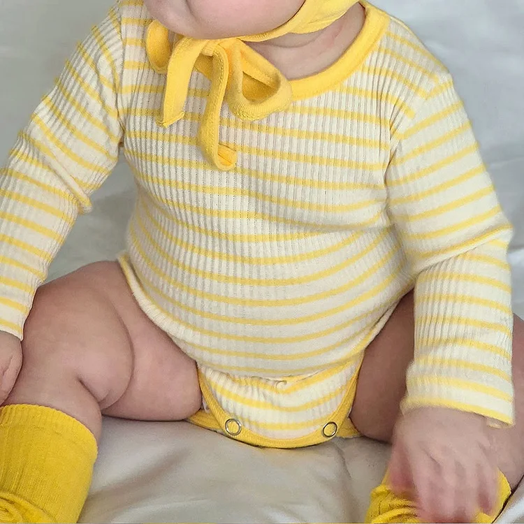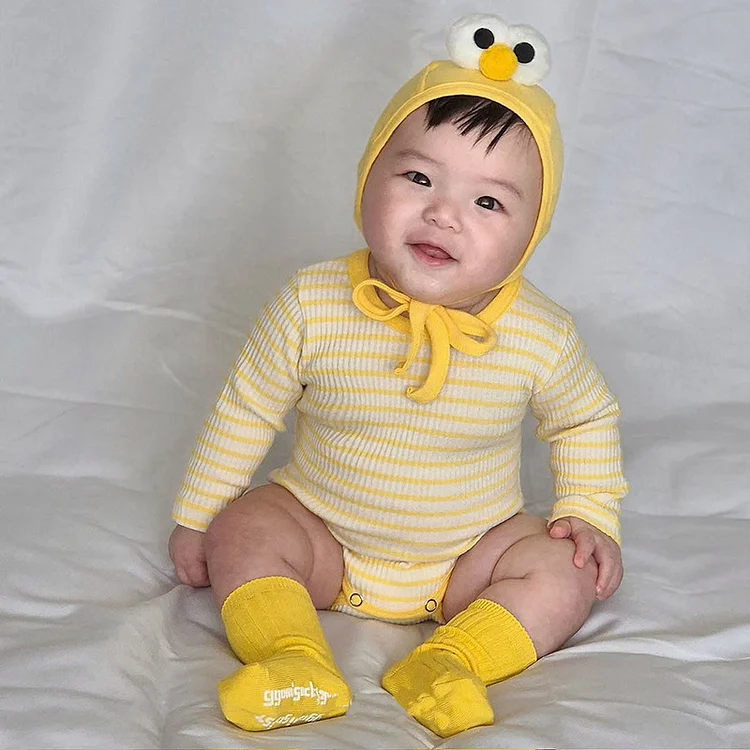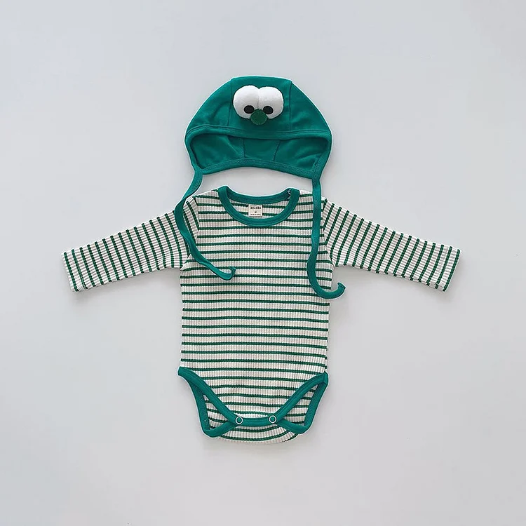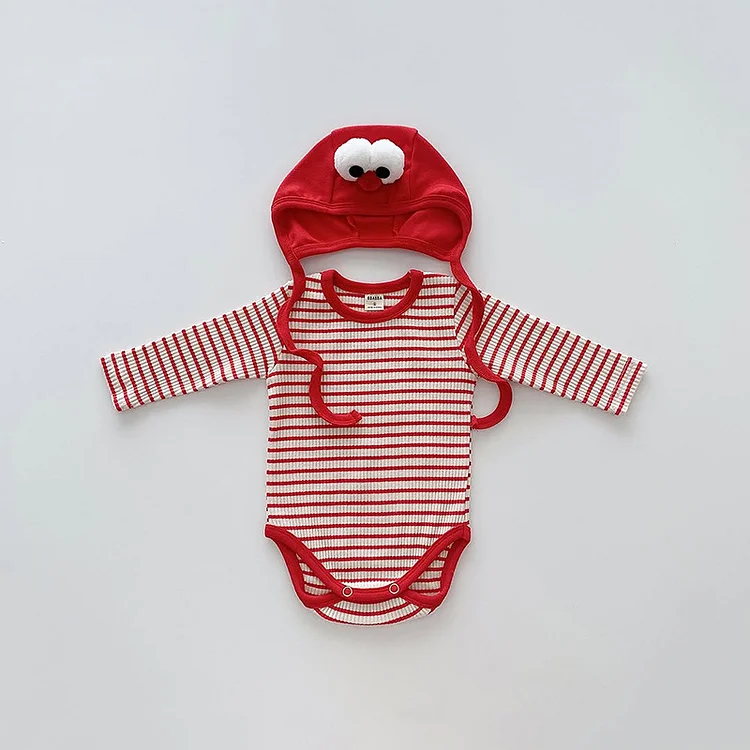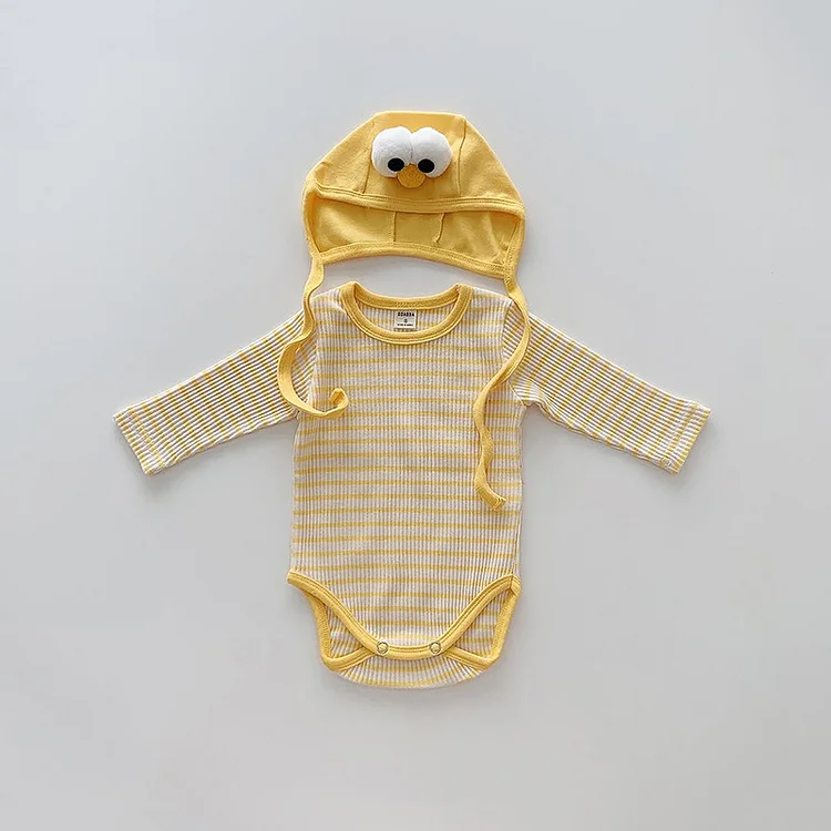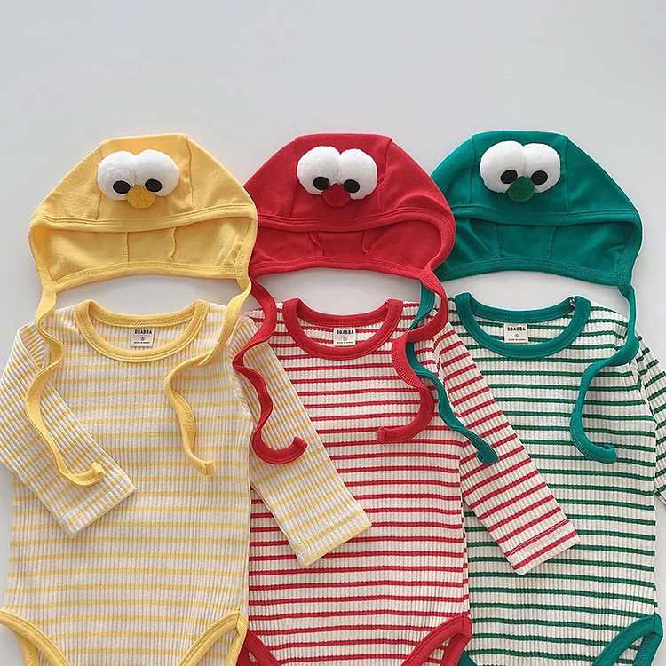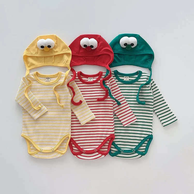 [66-90cm]帽子付き 目デザインボーダー ロンパース