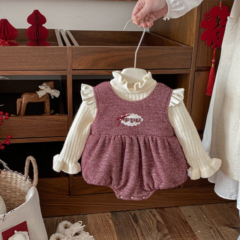 [66-100cm] 蝶結び 刺繍 あったか ロンパース、ワンピース