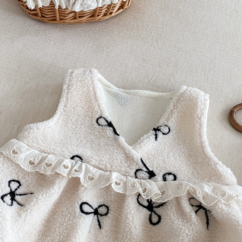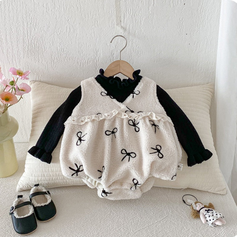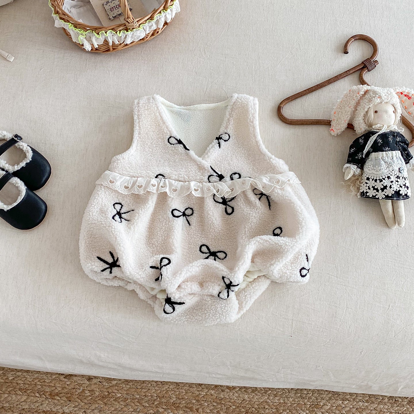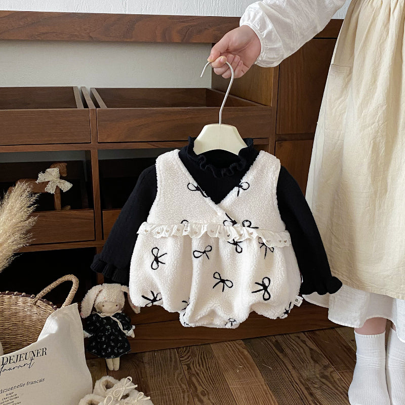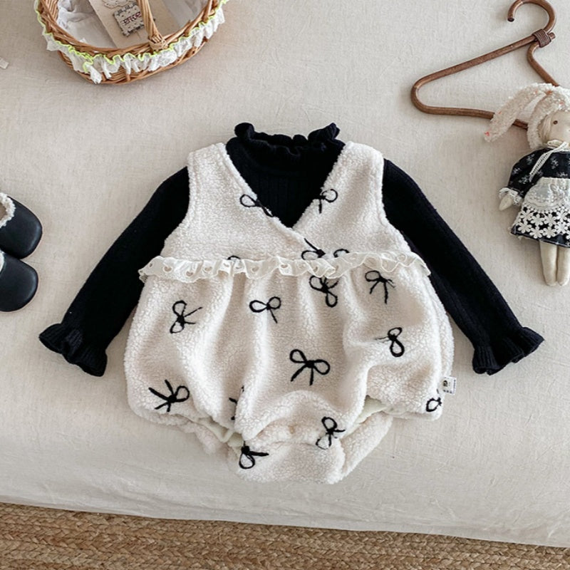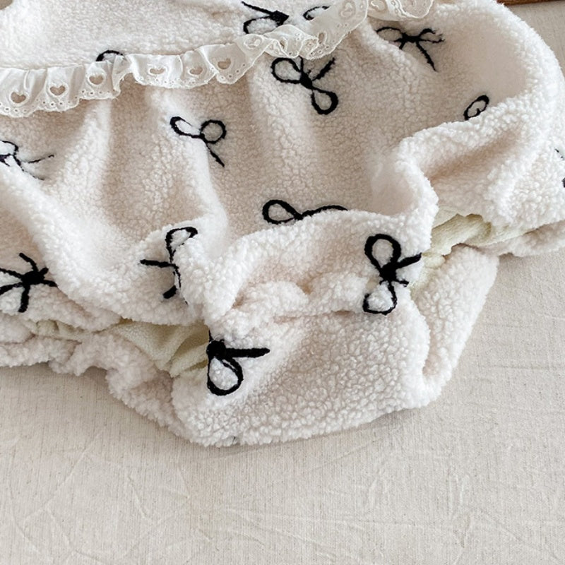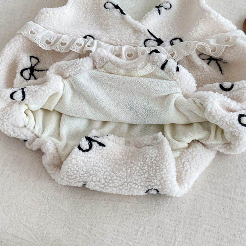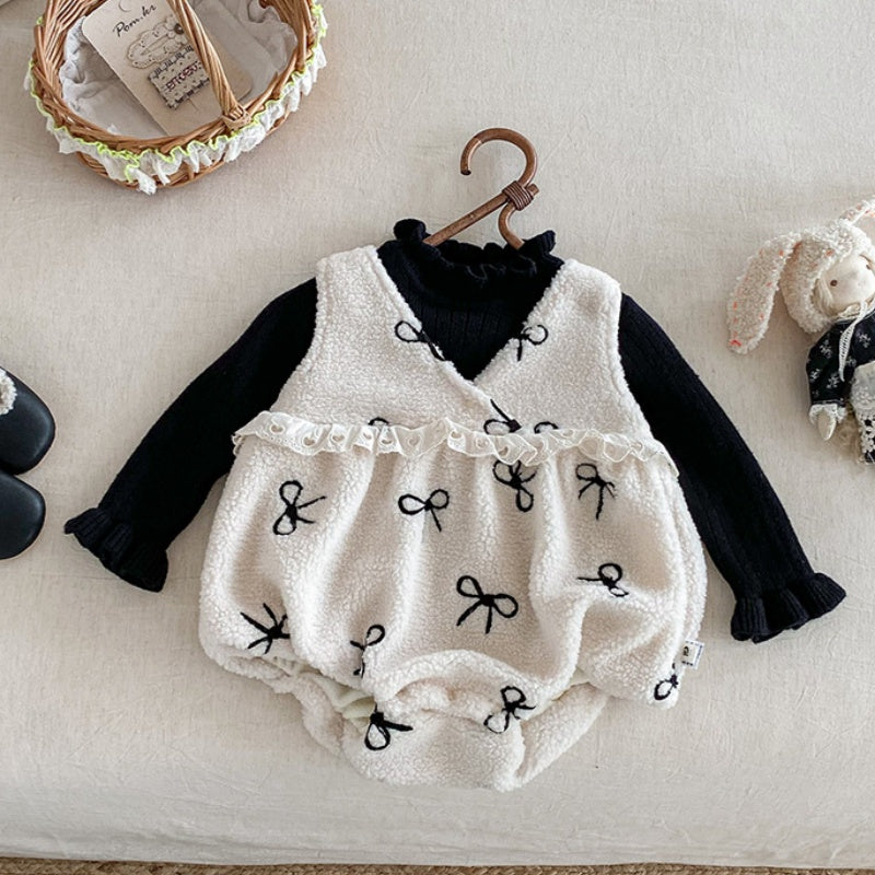 [66-90cm] ボア リボン 刺繍 ロンパース