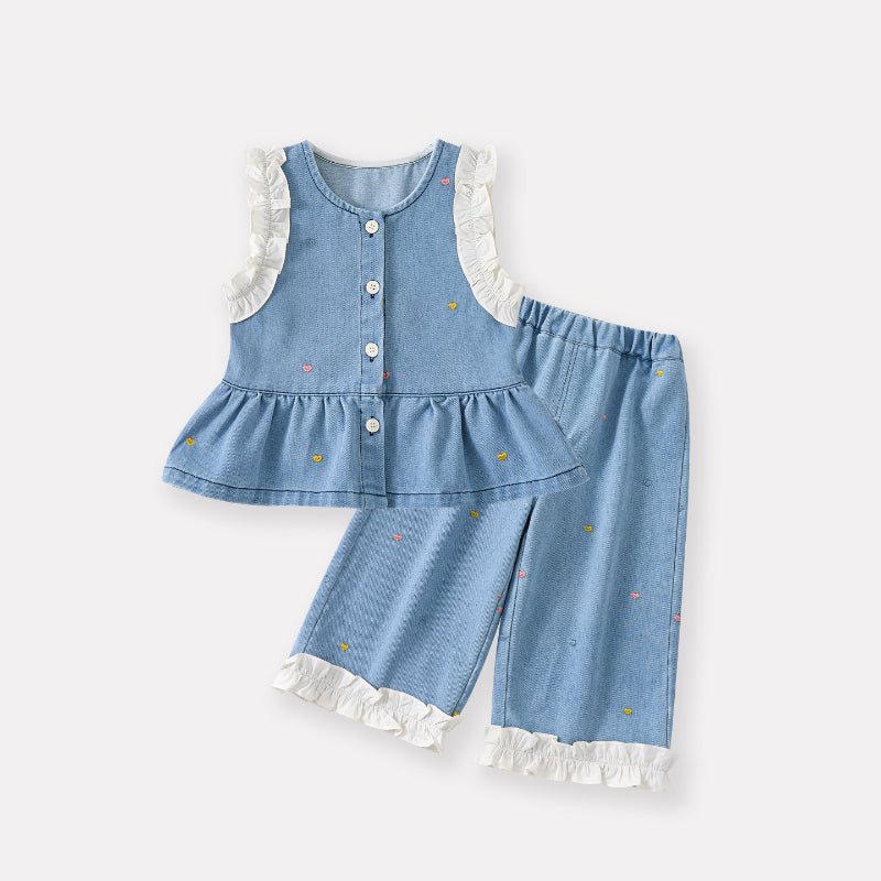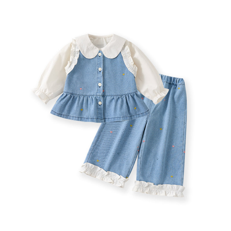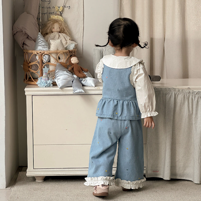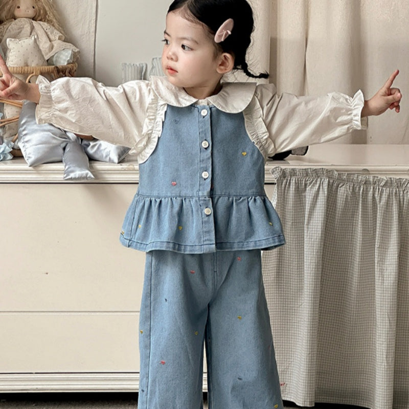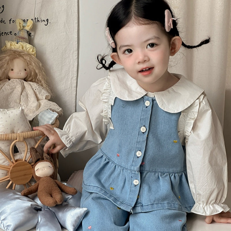 [73-100cm]ハート刺繍デニムベスト デニムパンツ 襟付きシャツ