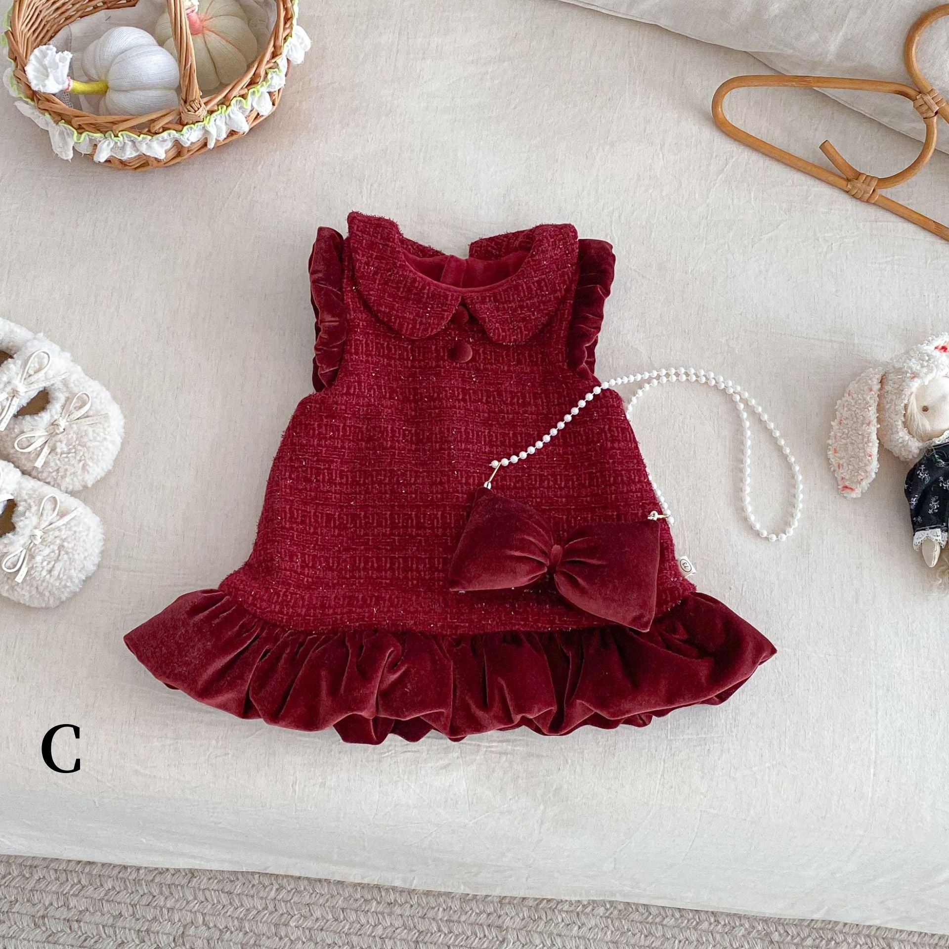[73-120cm] ツイード風 お姫様 ワンピース&リボンアクセ