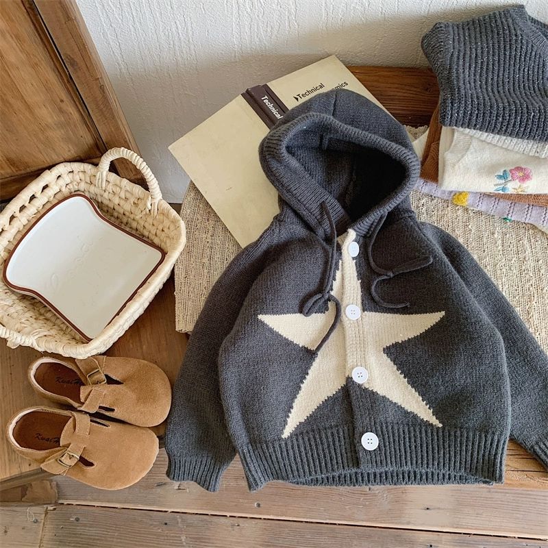 [80-140cm] 星柄 フード付き ニット カーディガン