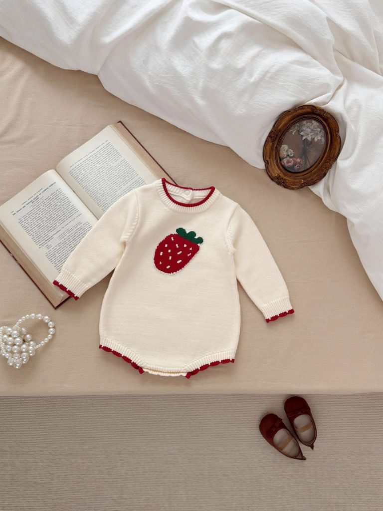 [66-90cm]いちご柄 ガーリー ベビー ニット ロンパース